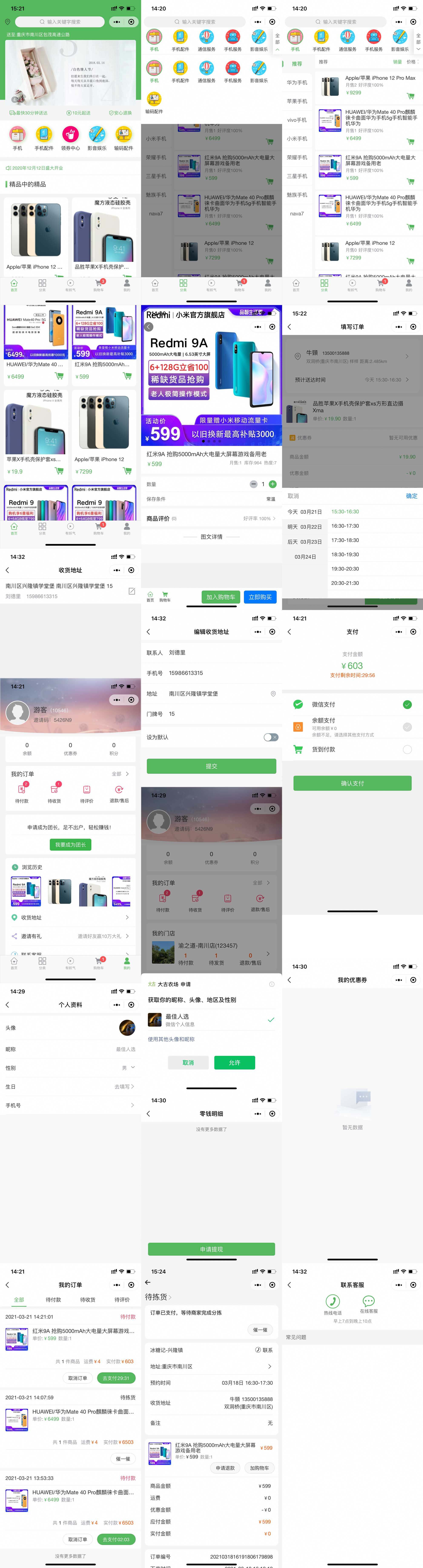- 我的,个人信息修改,头像修改,订单列表,商品浏览记录,地址管理,退出登录、自提点管理、客服中心、账户日志、收入提现、优惠券管理